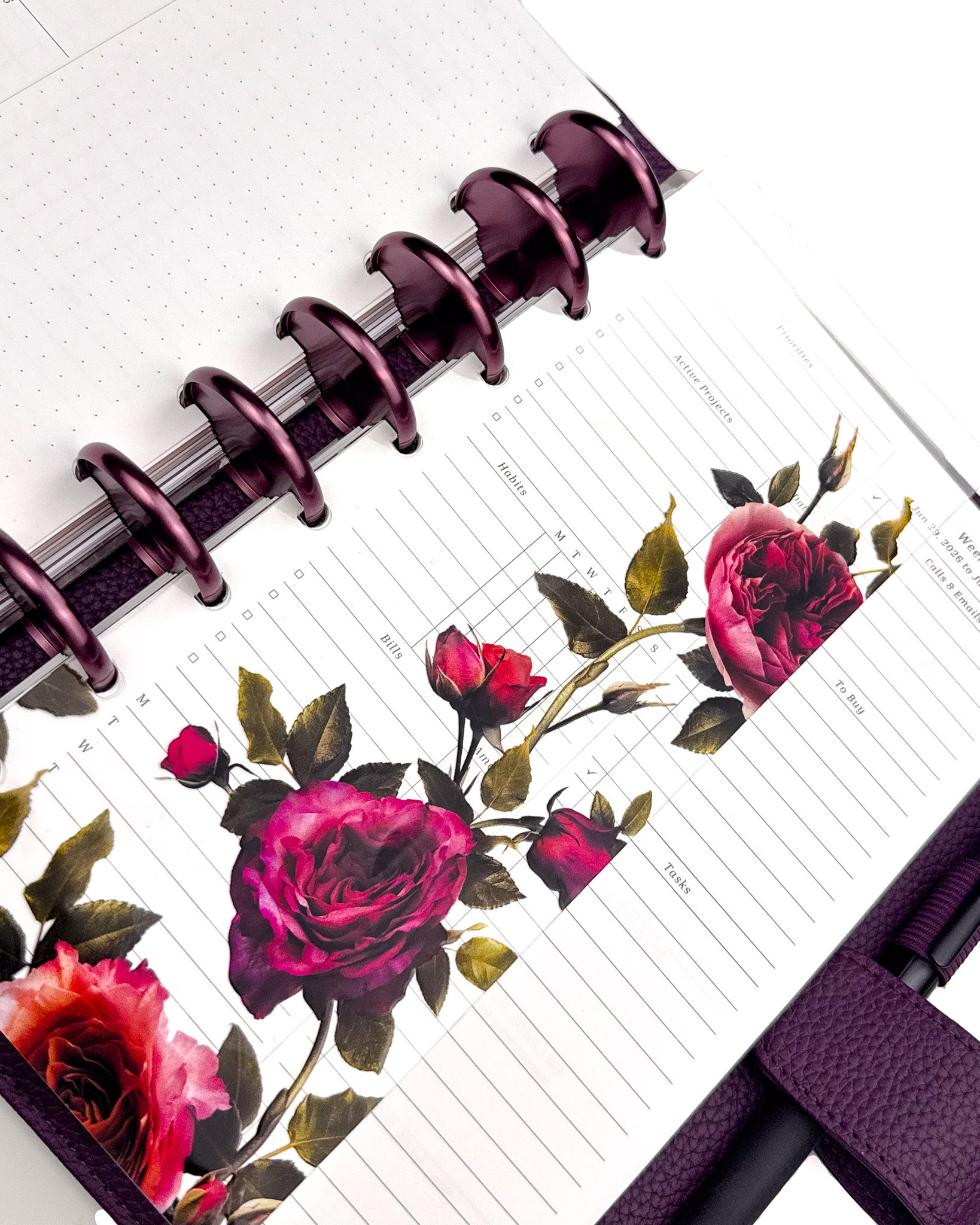 This clear plastic hybrid dashboard features vintage-inspired roses in rich blush and burgundy tones. Designed for discbound planners, it works as a page marker, divider, or layering piece, and doubles as a reusable surface for sticky notes and page flags, keeping your essentials visible and accessible. Stylish, sturdy, and beautifully functional.