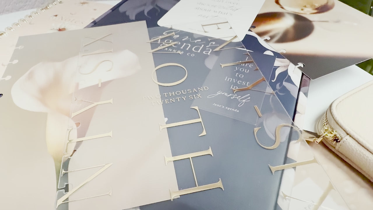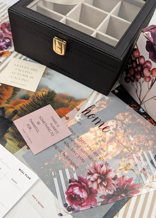 This box is thoughtfully curated to support your financial wellness and personal growth. Inside, you’ll find tools designed to help you budget smarter, track spending, and stay focused on your savings goals. Paired with elegant leather accessories, gorgeously curated planner pieces, and a journal perfect for daily reflections, this box is all about setting a strong foundation for the year ahead. This theme was strategically designed to feature a soft, minimalist color palette of white, beige, blush pink, and dark French blue, with delicate white floral accents that add a calming, elevated touch to your planning routine.