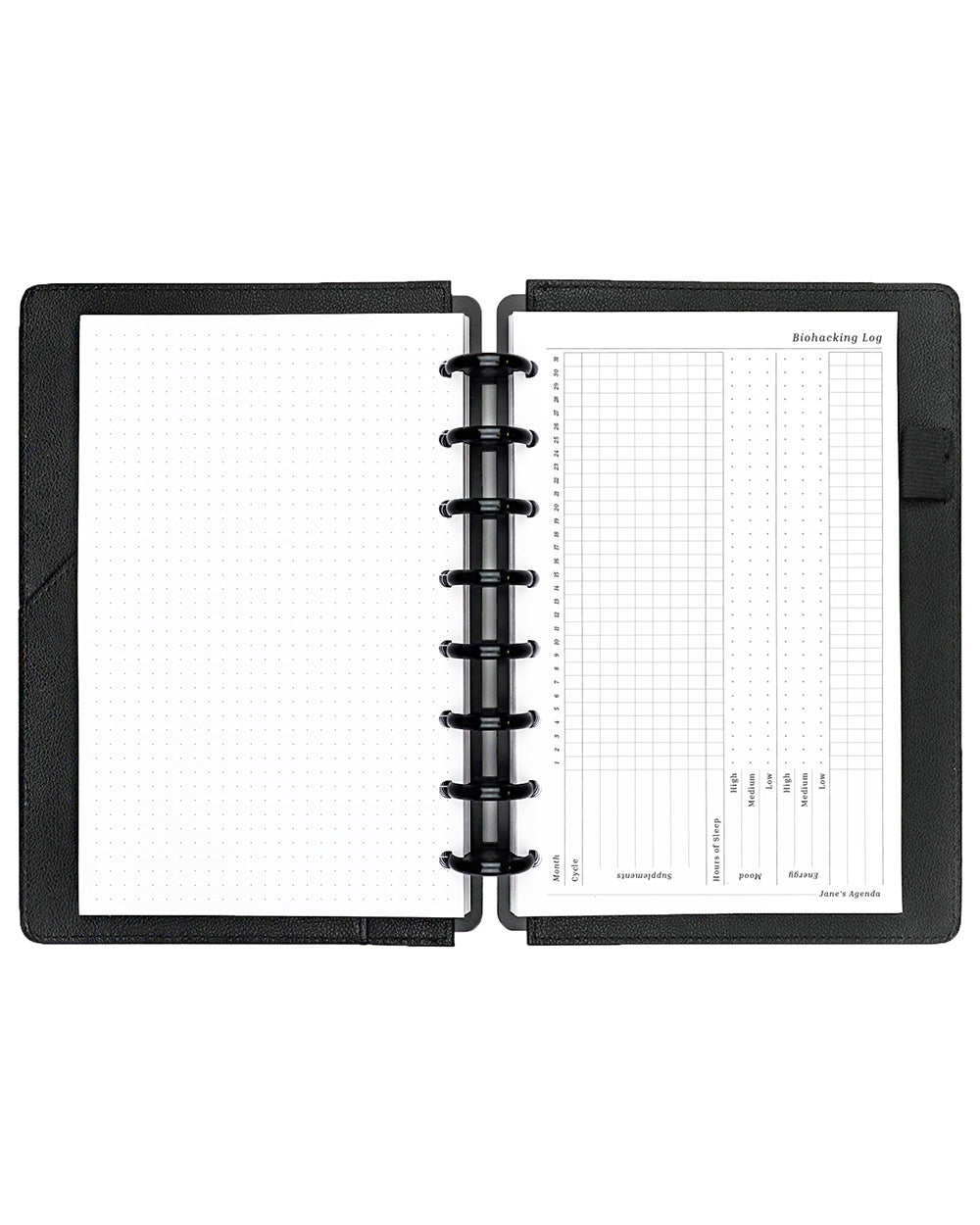 This versatile insert functions as a fitness journal and health log, with a guided layout to support habit tracking, mood logging, sleep analysis, energy levels, supplement use, and cycle insights—all on a single page. Perfect for in-depth health tracking, the facing dot grid page offers flexible space to journal, reflect, or tailor your layout to your personal needs.