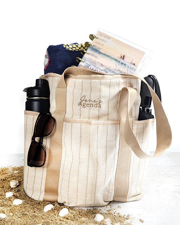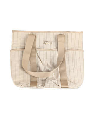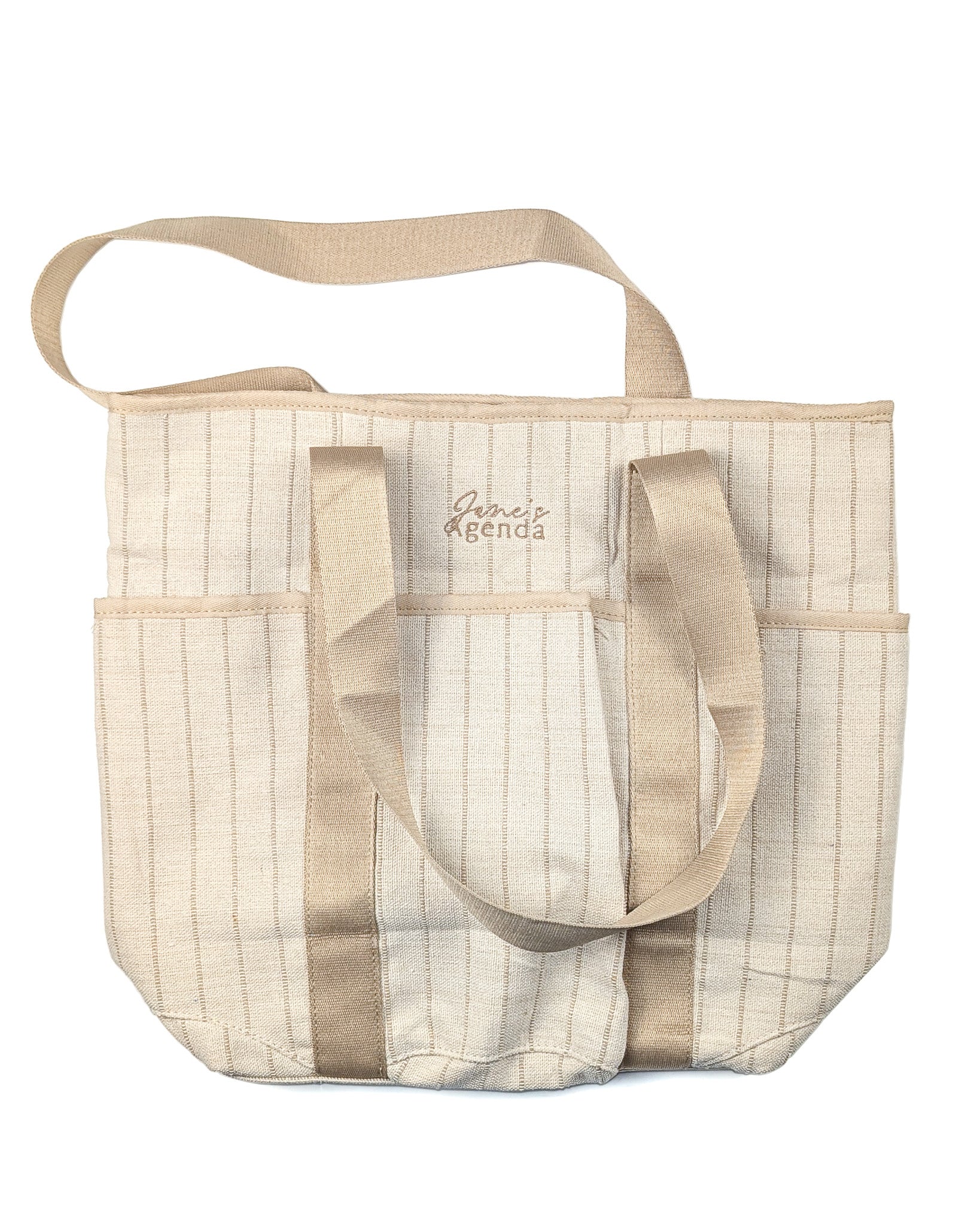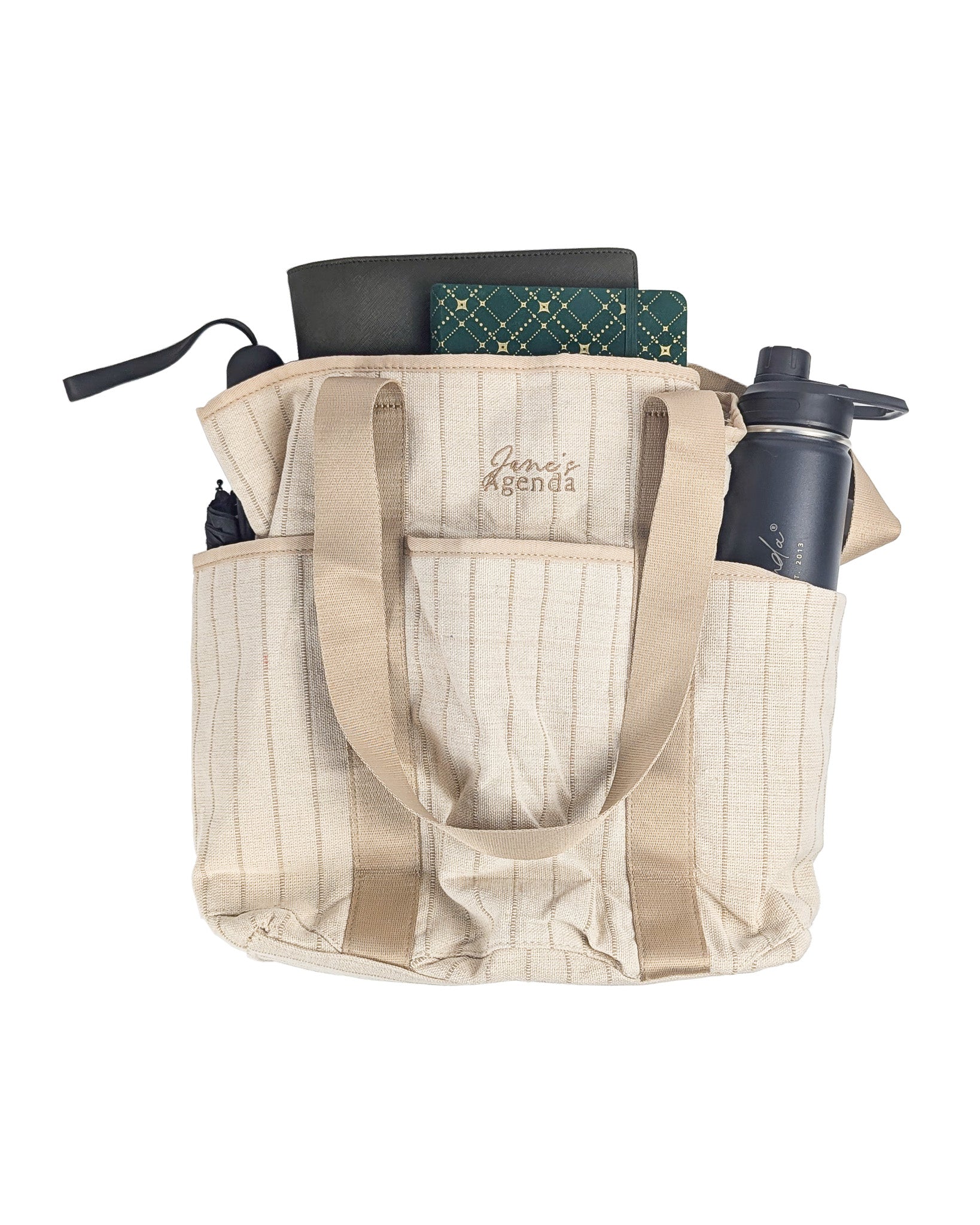 This custom designed, luxury beige tote bag features a subtle pinstripe pattern and three exterior pockets that help keep essentials handy, while the open main compartment is ideal for your favorite planner, accessories, and more.
