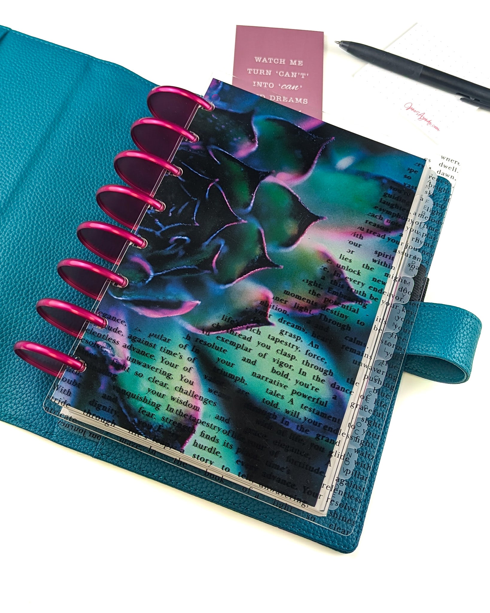 This gorgeous planner cover boasts a beautiful book text design in black ink that is sure to inspire you while planning and layers gorgeously over just about anything!