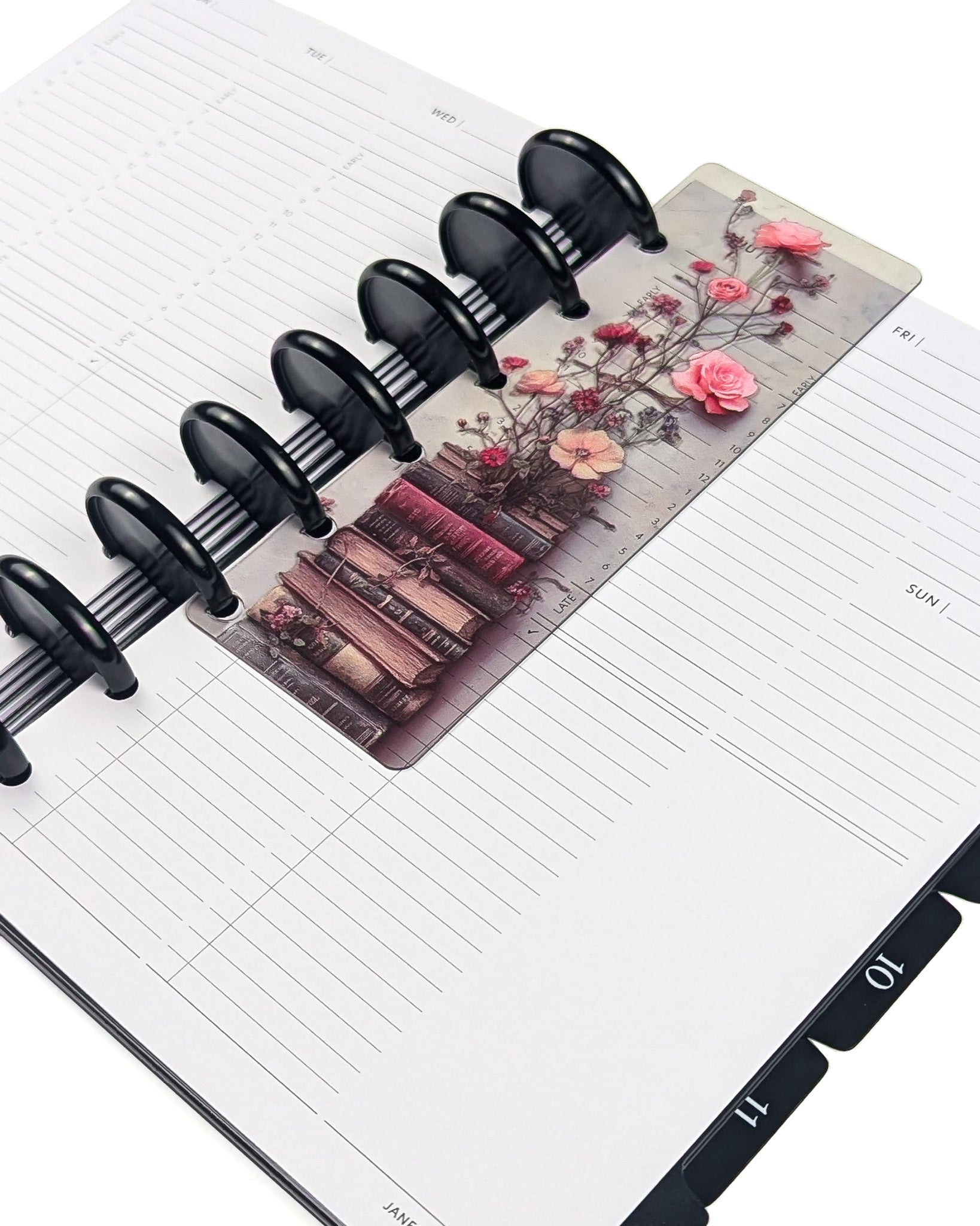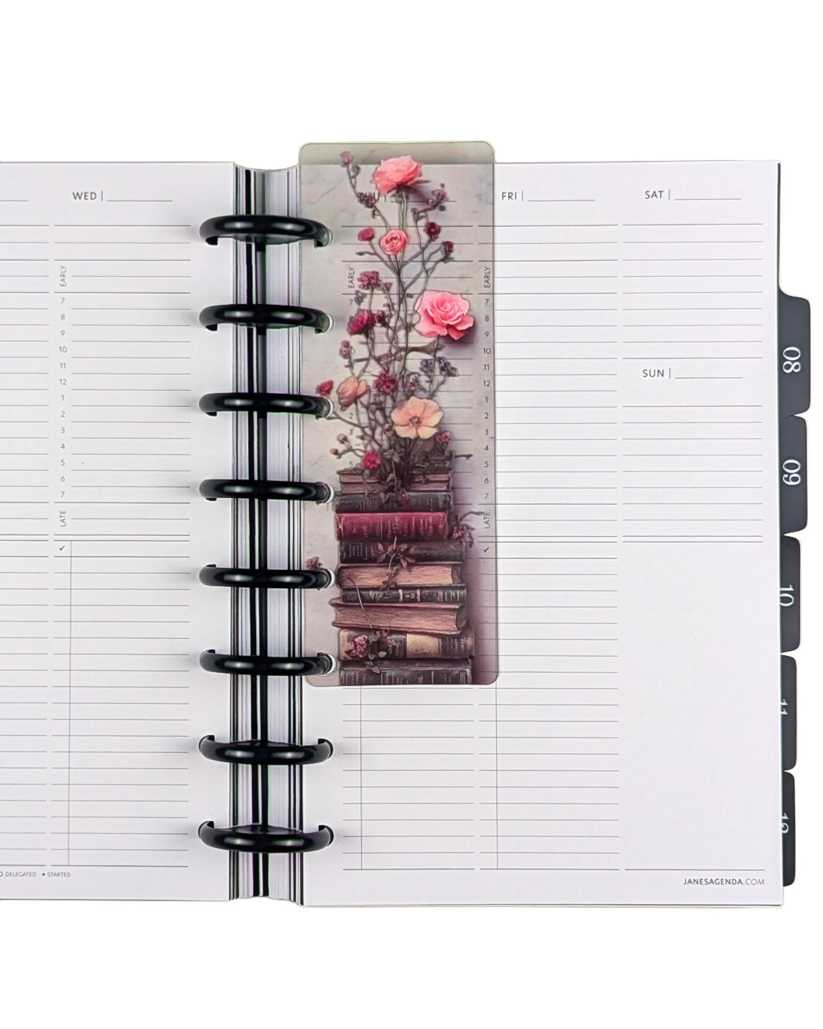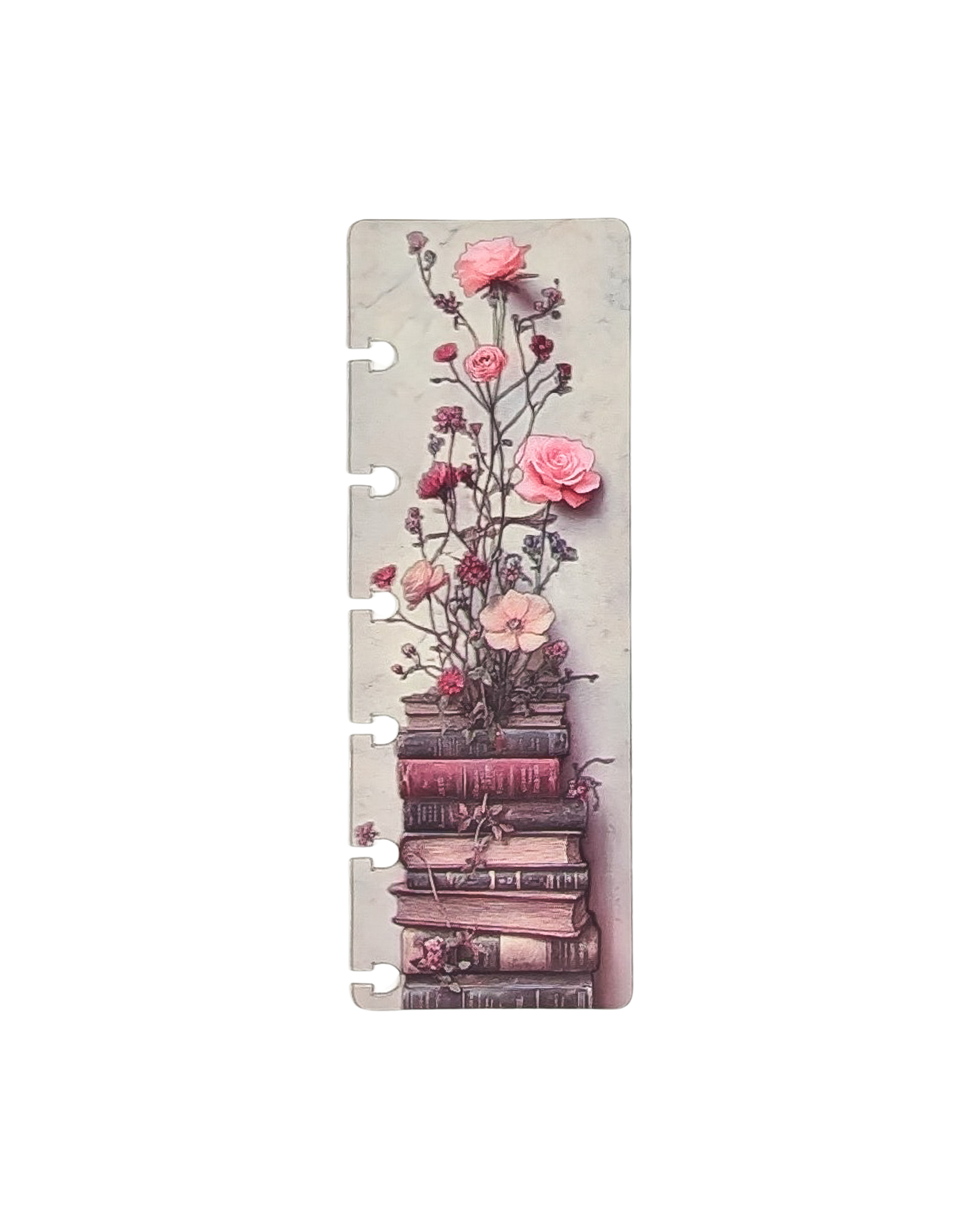 Keep your place in your planner with this one size fits all Floral Book Stack Page Finder, featuring a stunning vintage-inspired design of stacked books and blooming flowers.