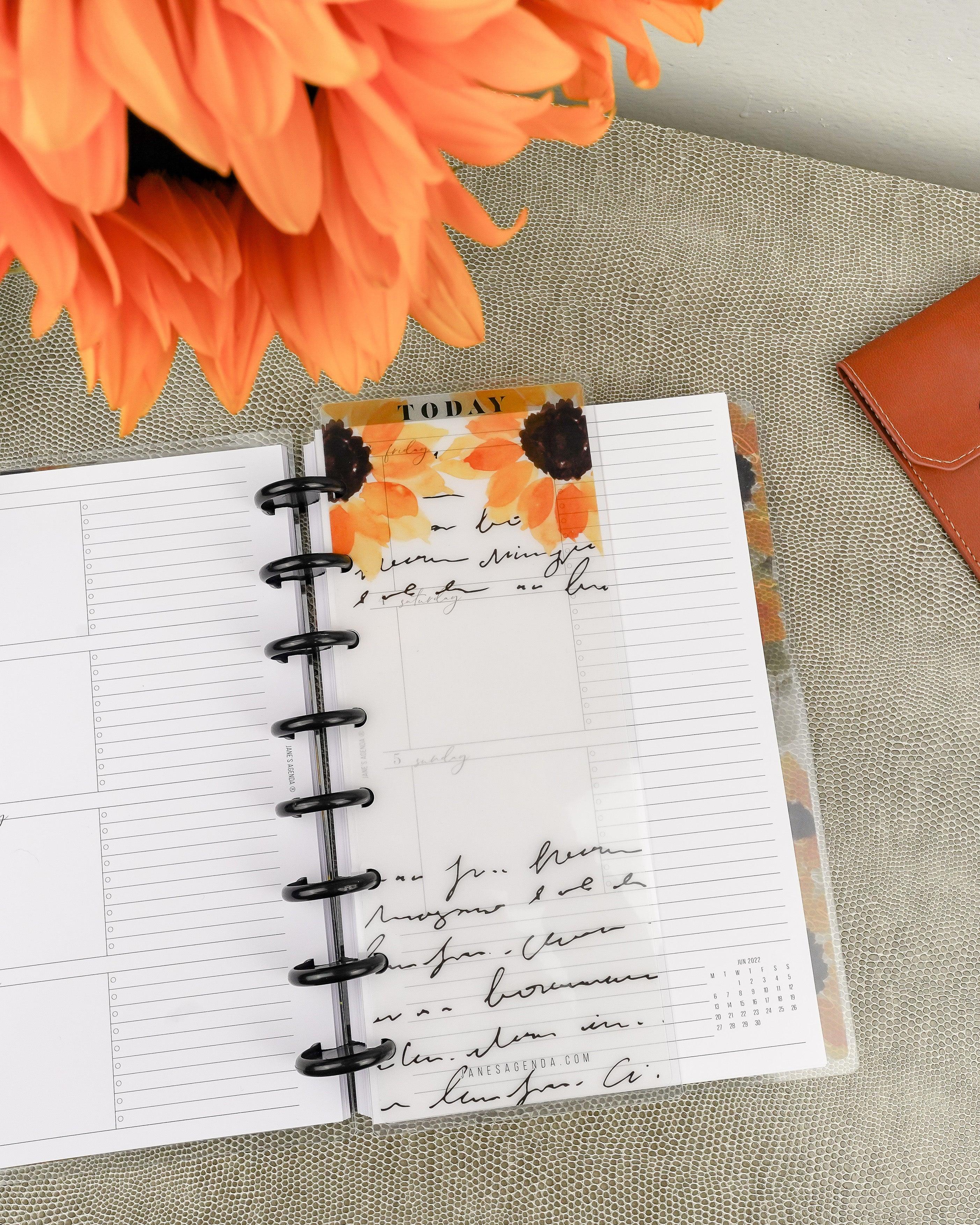 This hybrid planner dashboard of gorgeous sunflowers is the perfect way to find your spot in your planner and also a genius place to feature your sticky notes for the day.