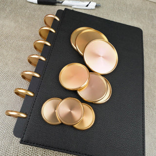 Set of 9 discs in each pack. These aluminum metal binding discs are the perfect choice for your discbound planner system if you like maximum durability and stability blended with beautiful style.