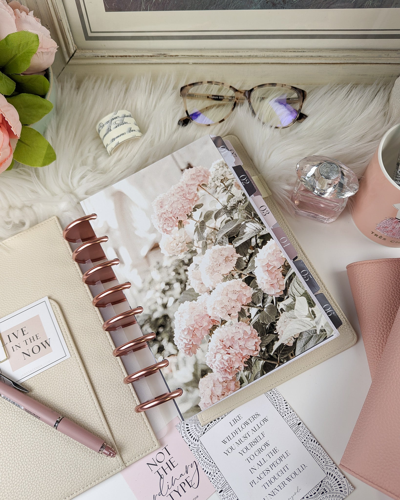This planner dashboard features an assortment of bright and cheerful light pink hydrangeas, perfect for the lover of flowers and all things floral.