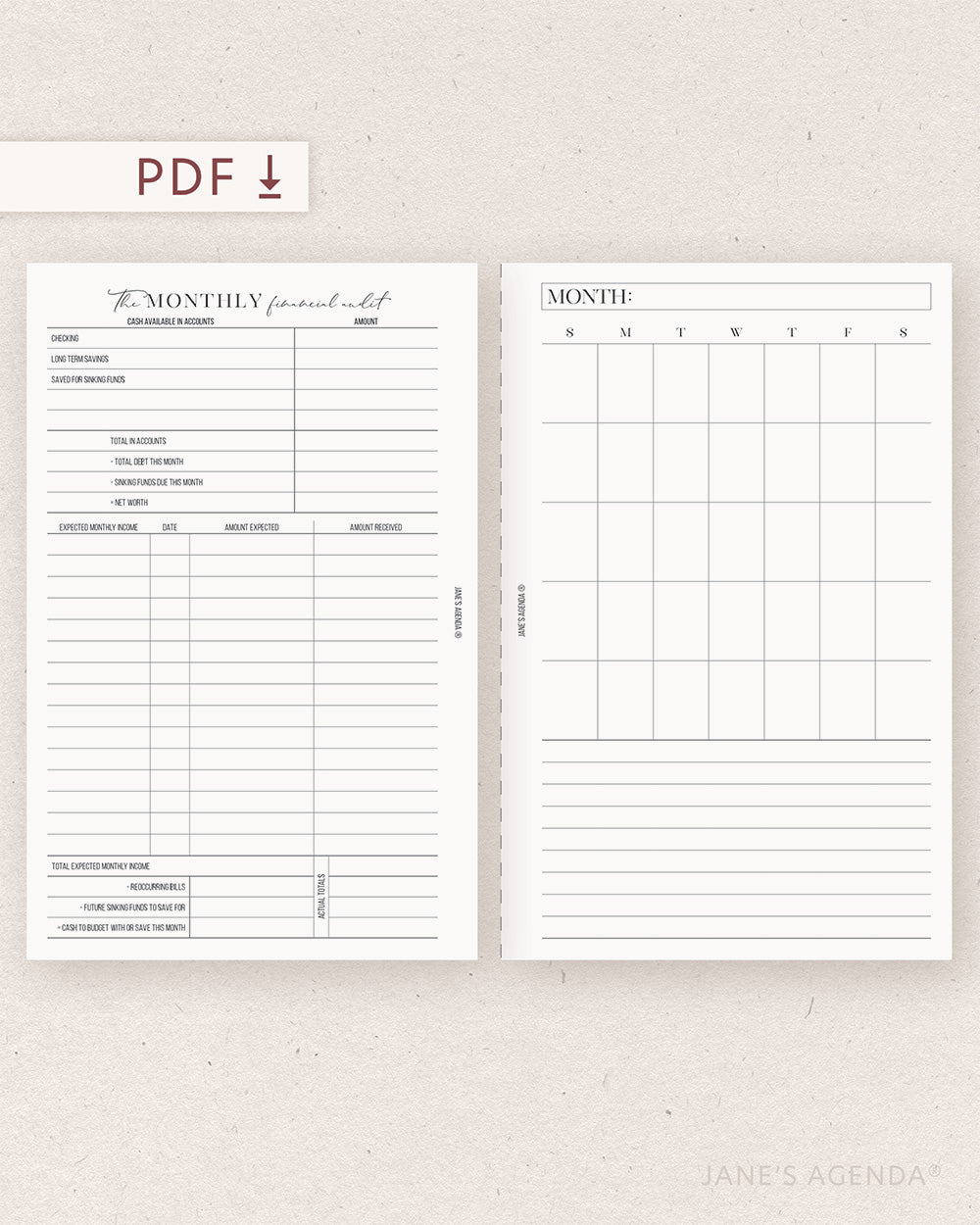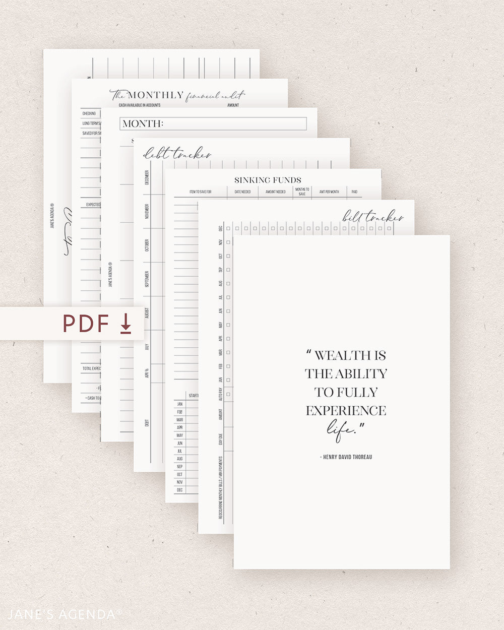 This all-in-one PDF kit includes thoughtfully structured pages that support a complete financial overview—from monthly budgets to debt payoff plans and savings goals. Each insert is designed for simplicity and functionality, featuring minimalist layouts that reduce visual clutter and improve usability. Use the included monthly overview, bill tracker, debt tracker, calendar, and sinking funds tracker to stay on top of your responsibilities and future goals.