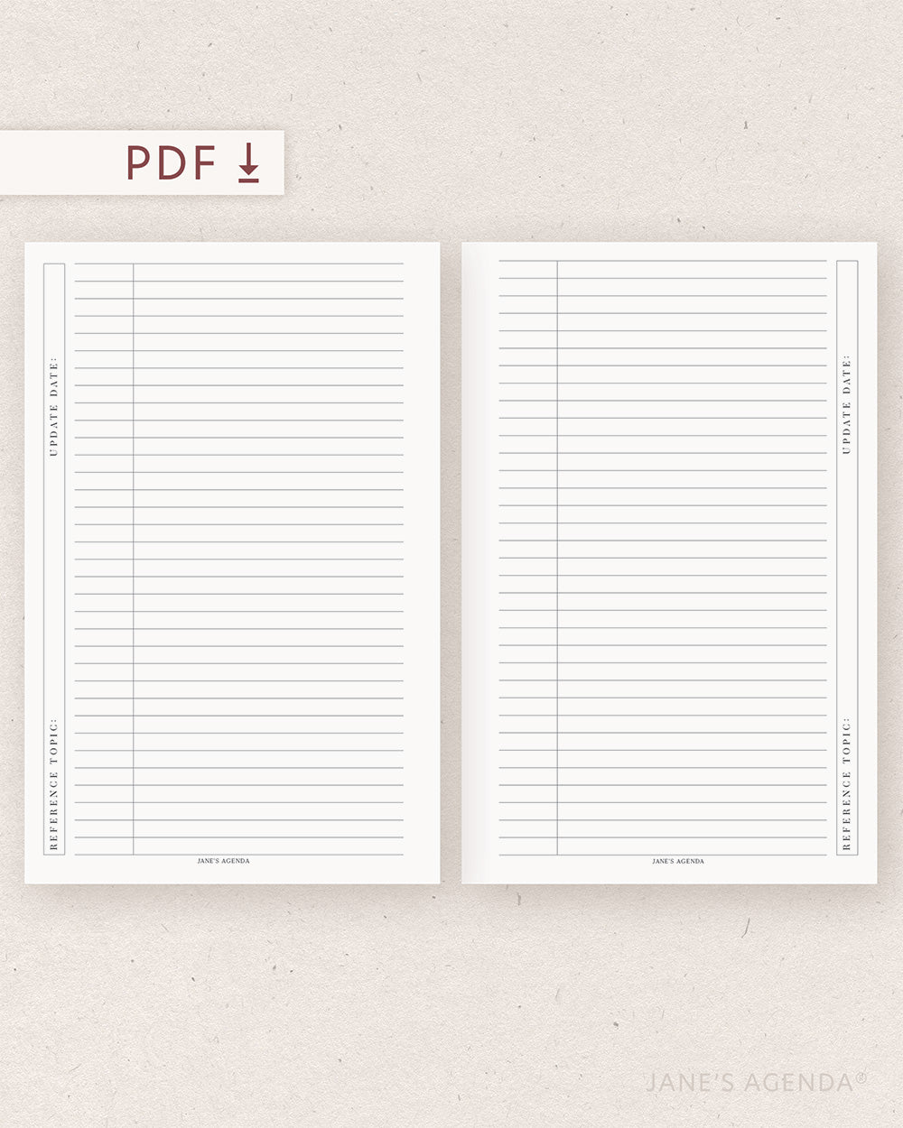 Each page features a clean, lined layout with space to log your reference topic and last updated date—perfect for tracking evolving details, project notes, client data, or educational content. Designed to support clarity and productivity, these minimalist inserts provide ample writing space and can be printed and reused to fit seamlessly into any planner or binder system.